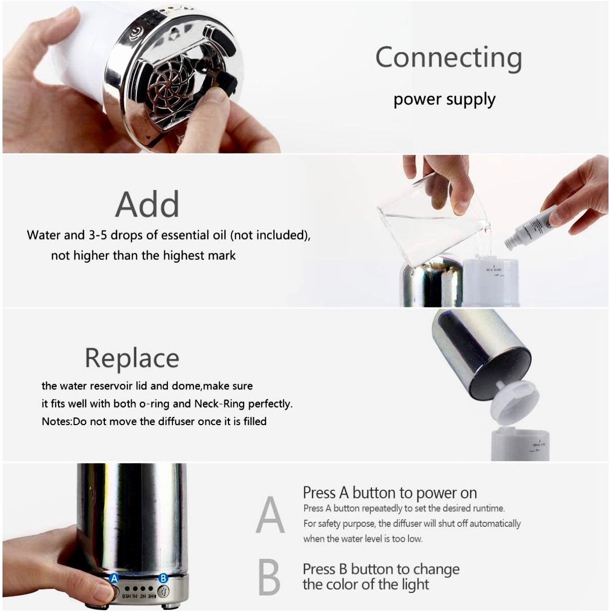 Just add clean water below the max line, select your preferred timer (0.5H, 1H, 2H, or 3H), and let the diffuser do the rest. The automatic shut-off ensures safety by powering down when water runs low.
